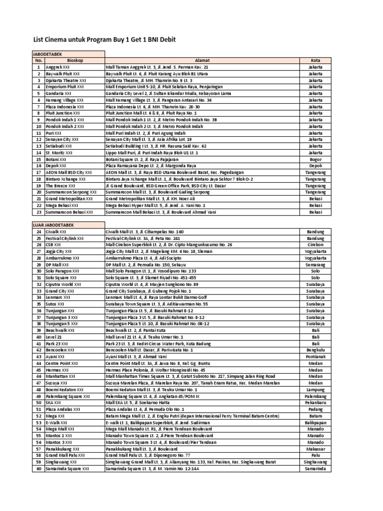 List Cinema Untuk Program Buy 1 Get 1 Bni Debit Jabodetabek No Bioskop Alamat Kota