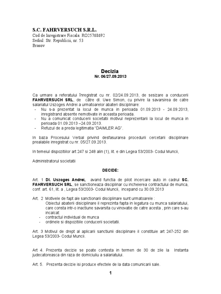 Decizia De Sancţionare Disciplinară A Salariatului Viaţa Liberă Galaţi