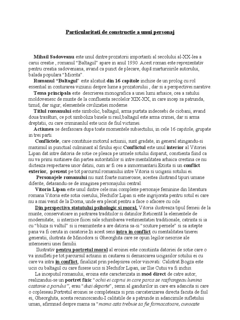 Doc Varianta 16 Particularitatile De Constructie A Unui Personaj De Mihail Sadoveanu Baltagul Vitoria Lipan Comuna Socodor Academia Edu