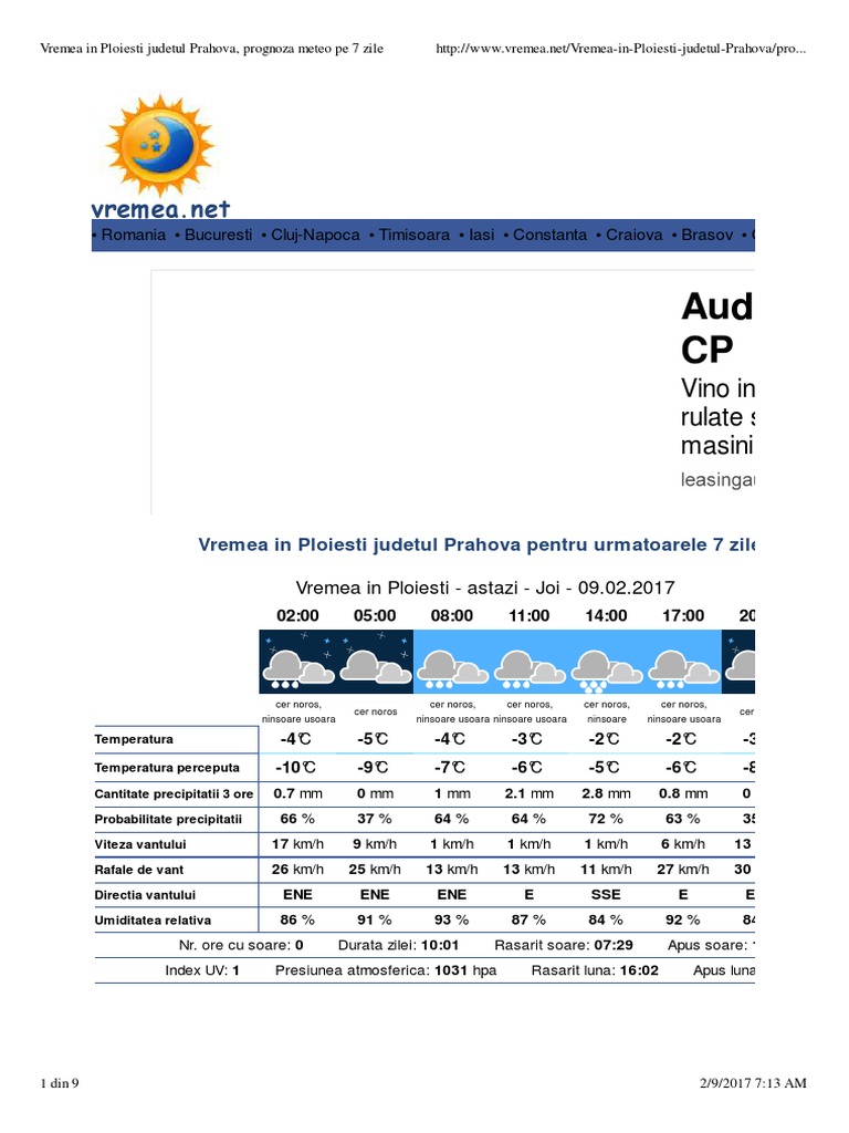 Vremea in romania pe 7 zile. Vremea pe 10 zile in romania afla prognoza meteo pe 10 zile dintr o privire. Pentru a afla prognoza meteo pe 10 zile pentru o comună sau un sat folosește lista localităților din județ aflată în josul paginii. Informația prognozei meteo vremei se actualizează zilnic. O pictograma cu starea vremii temperatura reala si cea resimtita scurta descriere a conditiilor atmosferice probabilitatea de precipitatii cantitatea de precipitatii umiditatea aerului viteaza vantului rafale de vant viteza maxima a vantului directia vantului.